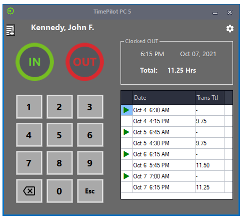 To clock in or out, simply enter the employee's 4-digit ID number. The employee's name will appear along with their transaction history. Click the IN or OUT buttons on the screen to complete the process. The transaction will be recorded and inserted into the TimePilot database.