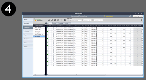 To see the clock-ins and clock-outs (also called "Transactions”), start the TimePilot 5 management software. It performs all the calculations and lets supervisors correct, insert and delete clock-ins or clock-outs, as well as create reports and prepare the data for payroll.