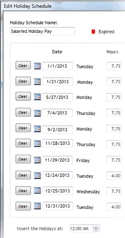 - It’s tempting to label your holiday schedules something like “Salaried Holidays 2012” or “Hourly Holidays 2012.” That’s a very clear way to do it, but by making the schedules specific to certain years, you’re going to have to create new ones every year (“Salaried Holidays 2013,” “Salaried Holidays 2014,” “Salaried Holidays 2015,” etc.) And then you’ll have to go through every employee’s profile every year to assign them that year’s holiday schedule. That’s too much work!