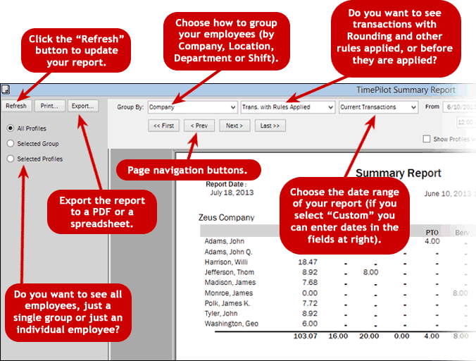 When you run a report in the TimePilot software, the software pulls data out of the database and displays in a format that you can print or use to create a PDF or even an Excel spreadsheet.